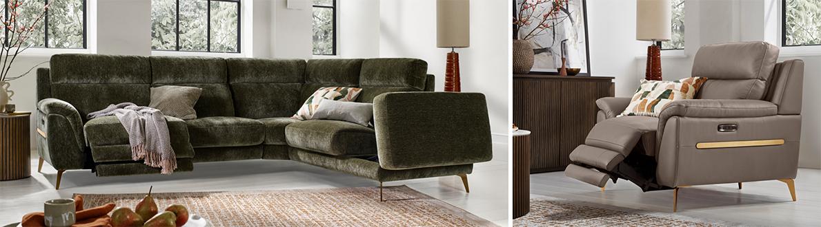 Luxurious, elegant and with plenty of add-ons, our modular Eclipse range puts other sofas in the shade. The look is sleek and chic with elegant touches that include metallic legs and trim, curved cushioned armrests and beautifully tailored upholstery. And as this is a collection that’s designed to soothe in style, seats and backs are sprung, seat cushions are sprung, arms are wide and seats deep. And that’s all before you consider the power features – power recliners, perfect-positioning power headrests, USB charging and even integrated LED dimmable lighting. Handcrafted exclusively for Furniture Village, the Eclipse range is available in a choice of fabric and 100% leather upholstery options.
