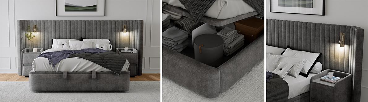 Inspired by the world’s finest boutique hotels, the Hyatt ottoman bed frame is here to transform your bedroom. With its wide winged headboard, built-in adjustable reading lights, ventilated mattress base, spacious storage compartment and hand-finished upholstery, this bed frame is a stunning example of contemporary design and expert craftsmanship. From the fully upholstered headboard and footboard to its domed and padded sides, everything about this storage bed is sumptuously cushioned. The range also includes an upholstered bedside cabinet that’s designed to fit perfectly between the bed frame and the edge of the headboard. The Hyatt range is a Furniture Village exclusive.