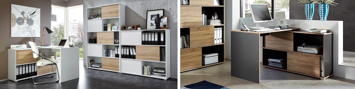 With the Wyatt collection of home office furniture, design is everything. From the clever corner desk arrangement complete with storage to the sliding doors that help keep your office paraphernalia hidden away or creatively displayed, this range makes putting together a stylish home office space a breeze. A durable finish, impact-resistant edges and sturdy load-bearing surfaces make this a really practical choice, too. It’s available in white and anthracite with oak-effect sliding doors that reverse to your chosen finish. A Furniture Village online exclusive collection, carefully made in Germany.